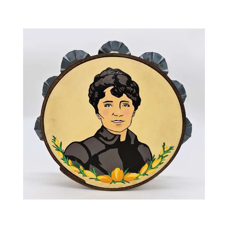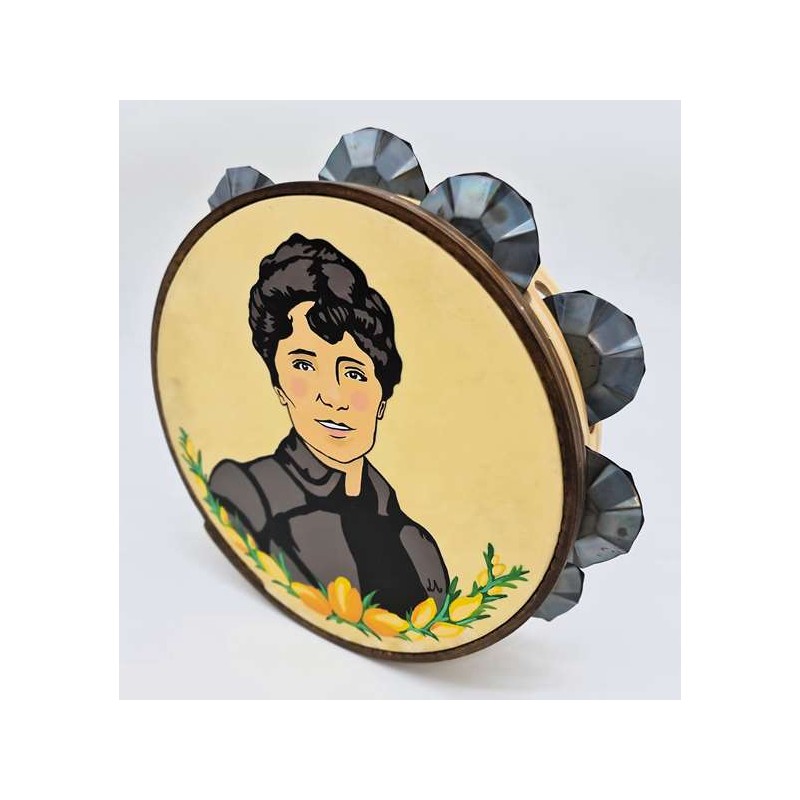 Pandeireta de 24.5 cm de diámetro e 6.5 cm de altura. Realizada en madeira de piñeiro e pel de ovella ou cabra cosida a man. Ten 9 pares de ferreñas Marusía feitas a man, con rebaixe na empuñadura con forma ergonómica.