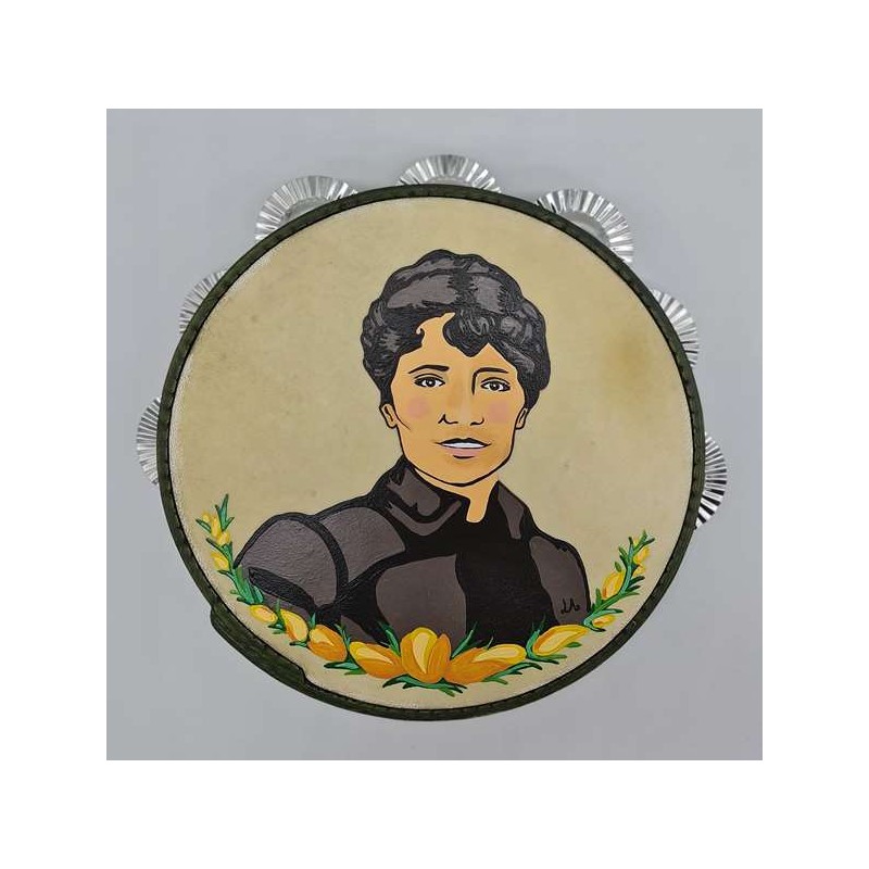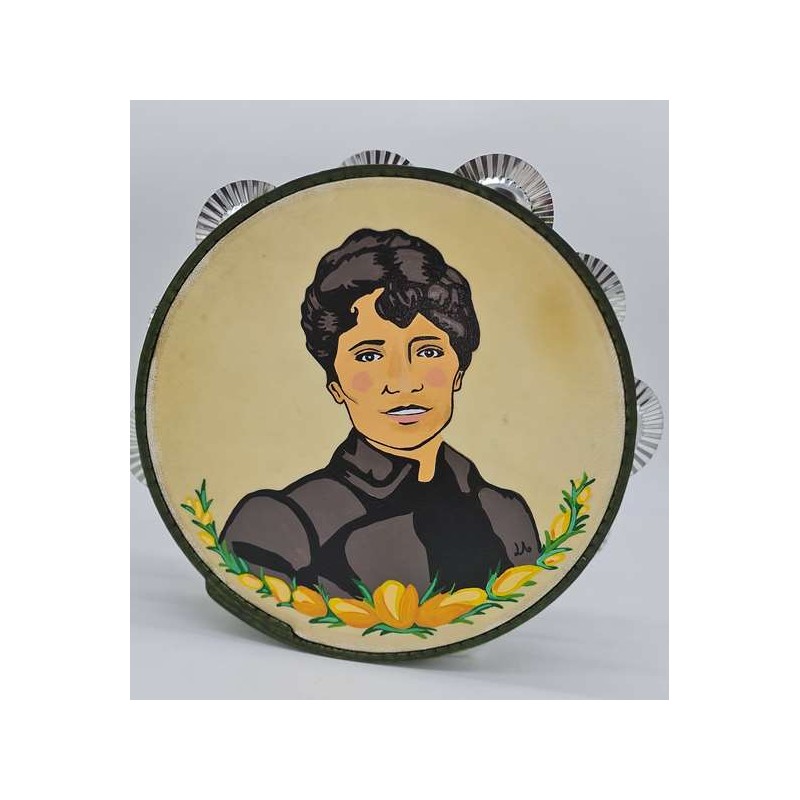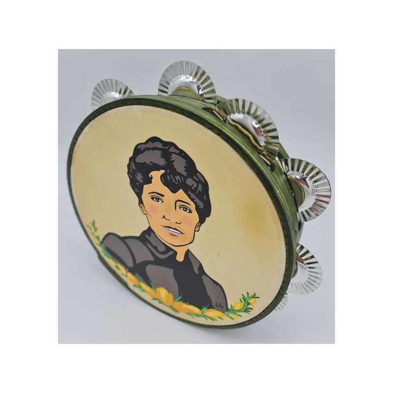 Pandeireta de 24.5 cm de diámetro e 6.5 cm de altura. Realizada en madeira de piñeiro en cor verde e pel de ovella ou cabra cosida a man. Ten 9 pares de ferreñas en folla de lata, con rebaixe na empuñadura con forma ergonómica.